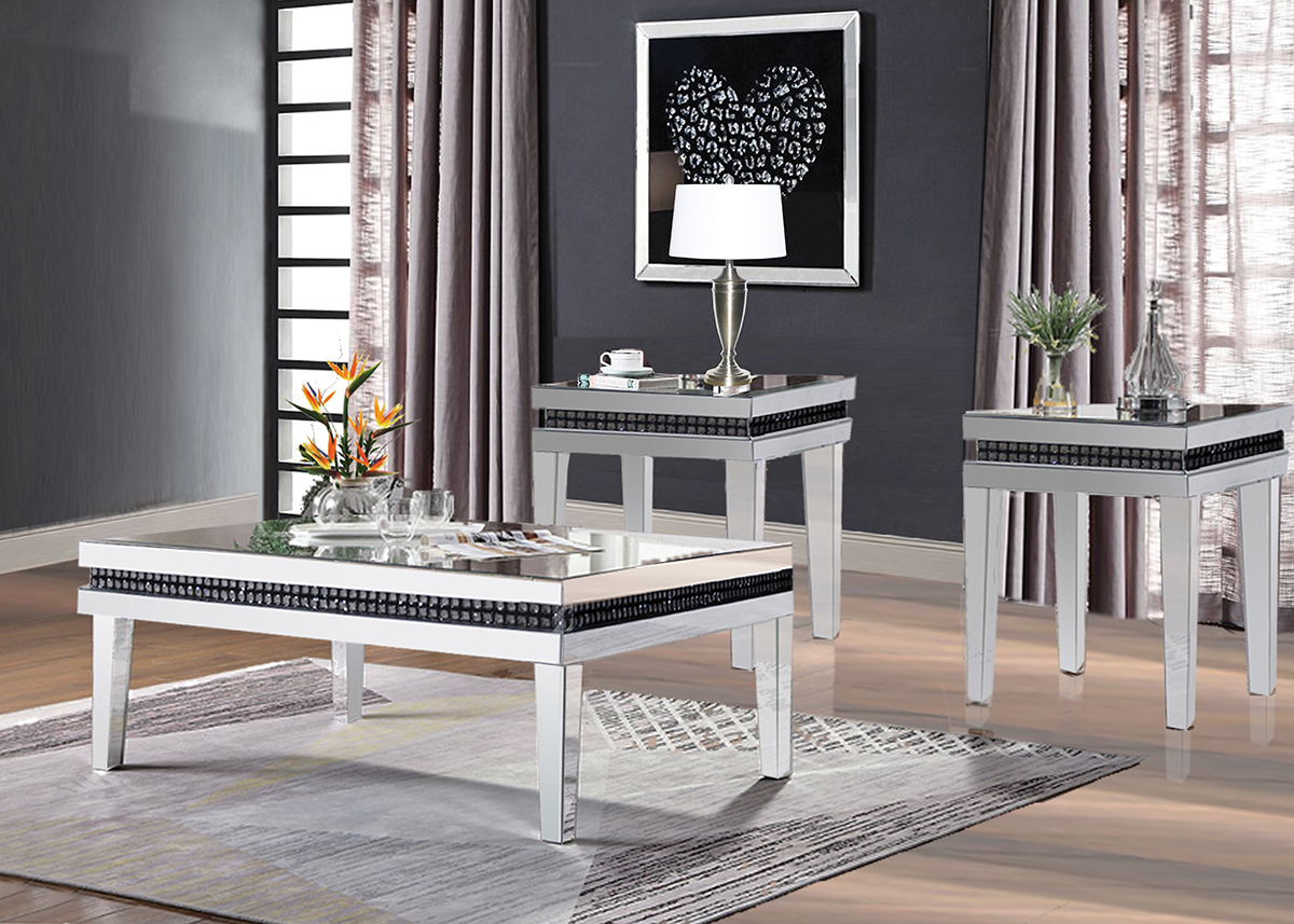 Glamour Styling Occasional Tables. Rectangular Shape Cocktail Table With Square Sized End Tables. All Mirror Tops And Legs With Dark Grey Cut Glass Accents That Border All Tables.Read More