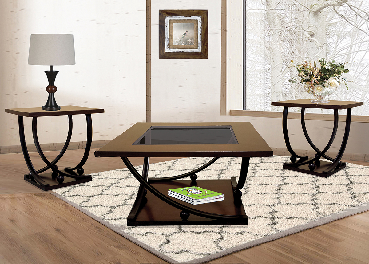 Contemporary Style 3 Pack Tables In A Medium Brown Finish. Bronze Finish Metal Legs. Cocktail Table Has A Bronze Glass Insert.Read More