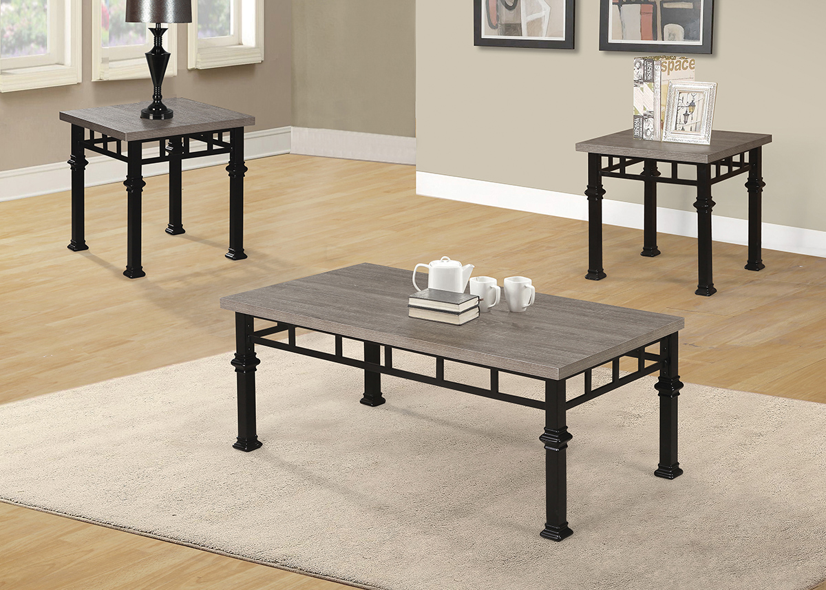 Transitional Styled Occasional Tables With Black Metal Base And Grey Weathered Tops. Tables Feature Ornate Leg Design And Apron. Living Rooms Can Be Cordinated With D370 And D470 Dining Sets.