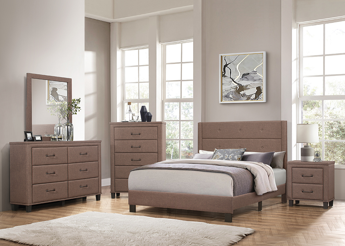 Contemporary Styling In A Brown Textured Fabric. Bedroom Features Straight And Simple Design. Requires A Foundation.
