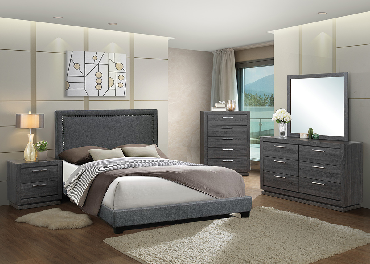 Modern Style Bedroom In A Gray Woodgrain Finish. Platform Base Design On All Case Pieces. Finished Drawers With French Dovetailing And Center Guide. Sleek Modern Chrome Handles. Upholstered Bed In Gray Textured Finish With Silver Nail Head Design. Available In Full, Queen And King Size. Bed Requires Foundation.