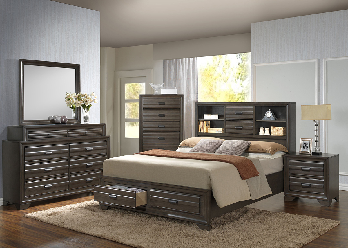 Contemporary Style In A Gun Metal Grey Finish. Set Features Unique Six Drawer Dresser With An Attached Two Drawer Jewelry Box. Bed Has Two Drawer Storage In The Footboard. Bed Has All Wood Slats So It Is Mattress Ready. Available In Full, Queen And King Size.