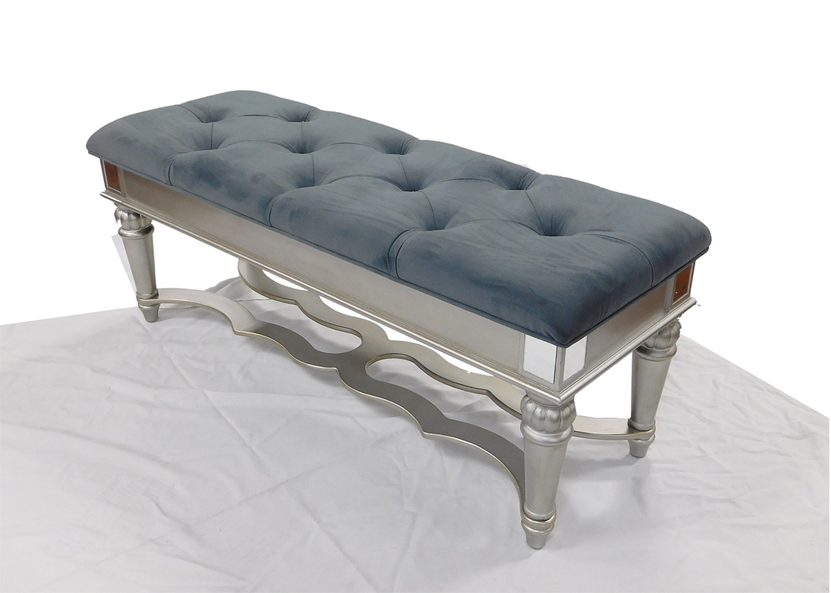 Exquisite Style Bench In A Slate Grey Velvet. Jewel Accent Tufting On The Seat. Mirror Accents On The Corners.Read More