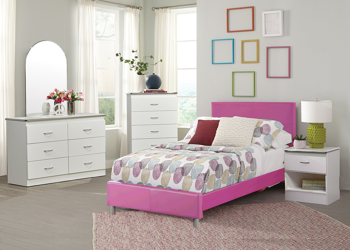Contemporary Style Bedroom In A White Finish. Chrome Trim Along All Edges. Roller Guided Drawers With Chrome Handles. Nicely Padded Pink Pu Bed. Bed Is Mattress Ready. Available In Twin & Full Size.