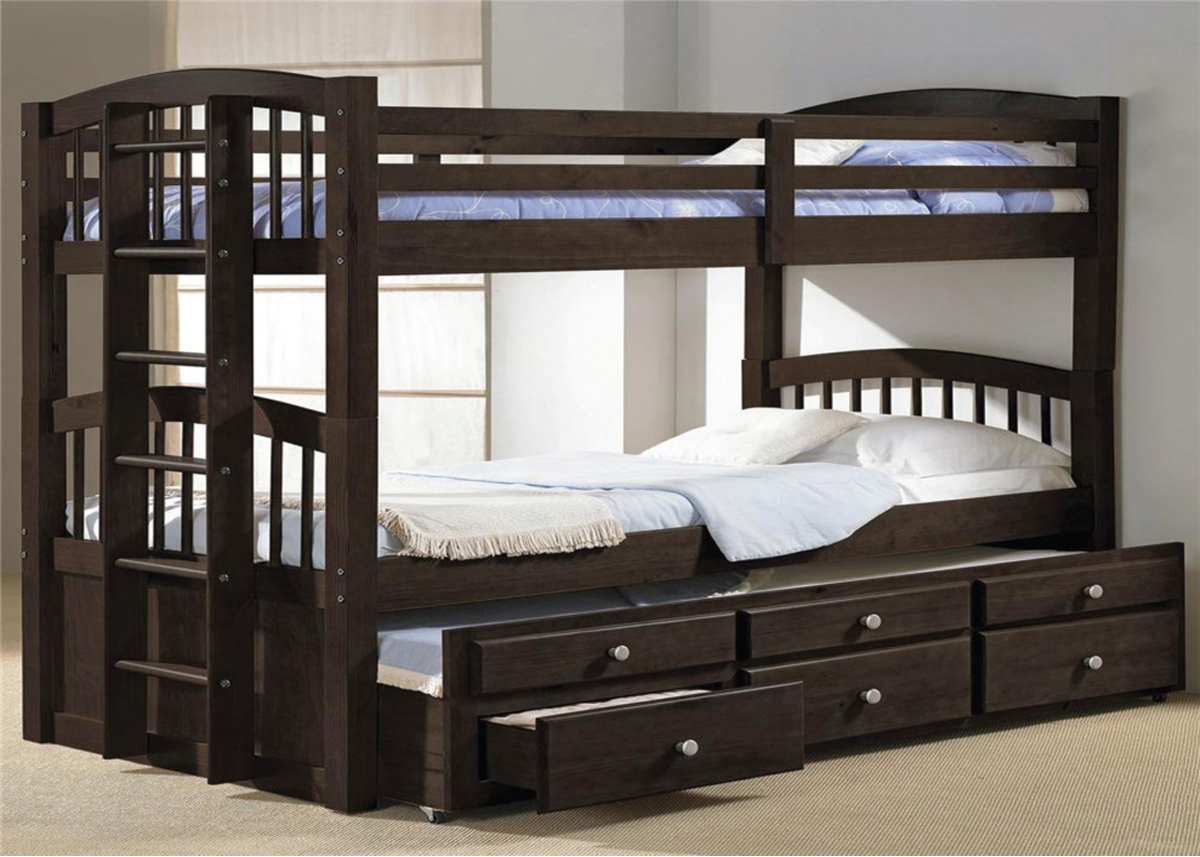 Wood Triplex Bunk Bed In An Espresso Finish. This Bunk Bed Features A Twin Over Twin Over Twin Bed With 3 Working Drawers. Bunk Bed And Trundle Have Full Set Of Slats, It Needs Mattress Only.