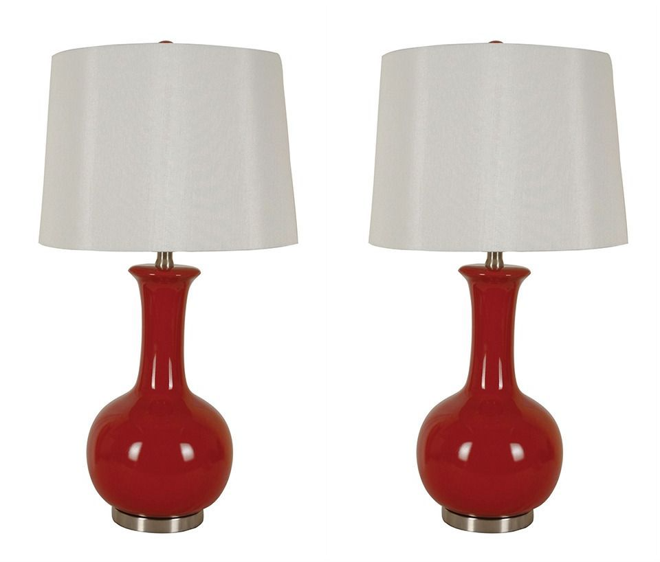 Table Lamp Features A Red Polyresin Base. Oval Hardback. White Shade.Read More