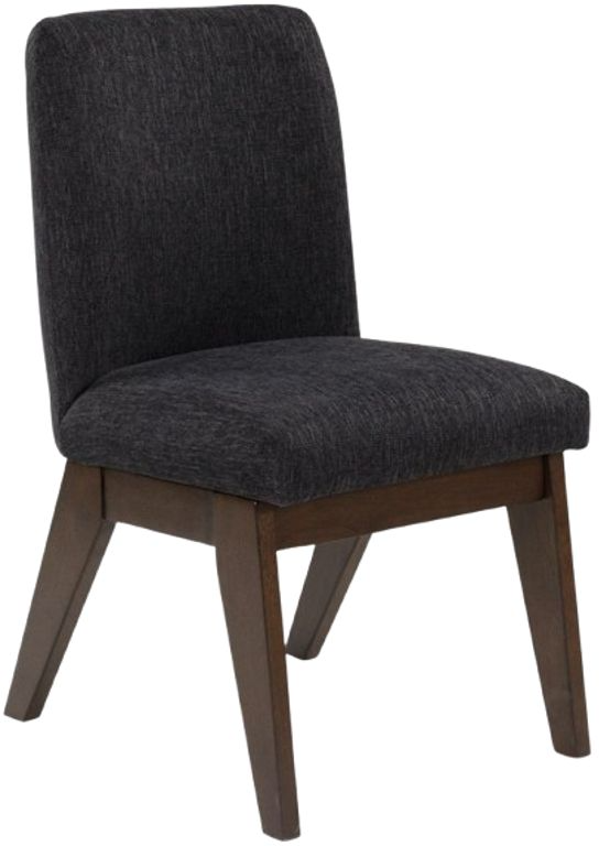 Casual contemporary styling with a decidedly modern vibe. Sitting atop a mid-century inspired base, this upholstered bucket dining chair has a rich warm brown finish that beckons everyone to gather around. Black textured upholstery dresses the chair in on-trend elegance. It's a simply stunning show of great taste.Read More